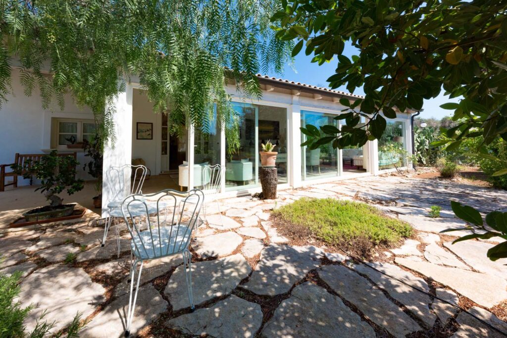 Sulla parte retrostante si trova una bellissima zona relax dove poter cenare sotto le stelle e un grande portico aperto da attrezzare con arredi da esterno. Da quest’area, tramite una scala, è possibile raggiungere il lastricato, dal quale si ha una bellissima visuale verso il mare.