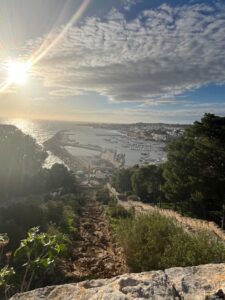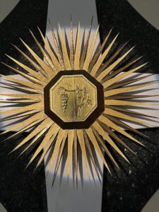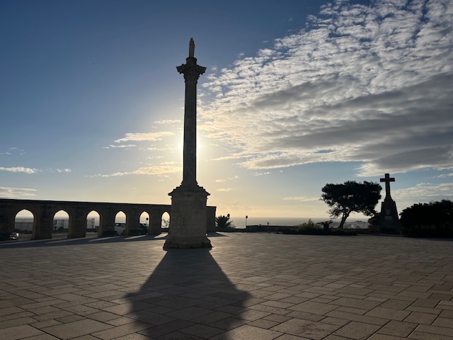 La colonna costruita nel 1694 da Filiberto Ajerbo D’Aragona- alta 10 metri. L’attuale statua marmorea è datata 1954 e raffigura la Madonna offerente il globo terrestre. Vista su Leuca (il nome deriva da greco Leukos- bianco) dal Santuario – una scalinata di 296 gradini che collega ⇓ Interno- pane e vino la Basilica al porto di Leuca ⇓